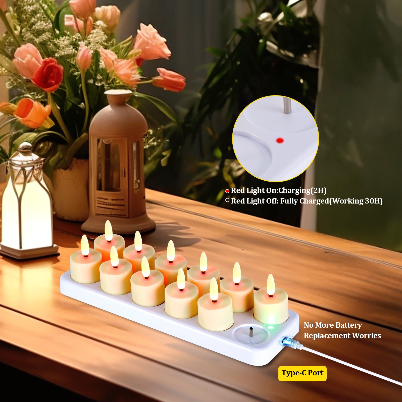 Rechargeable Convenience & Long Lasting Use: No more battery buying and replacing hassles! Our electronic candles feature a charging station for a sustainable candlelight experience, sparing you from the trouble of dealing with numerous lengthy data cables. Just 2 hour charging enables 30 hours of use.
