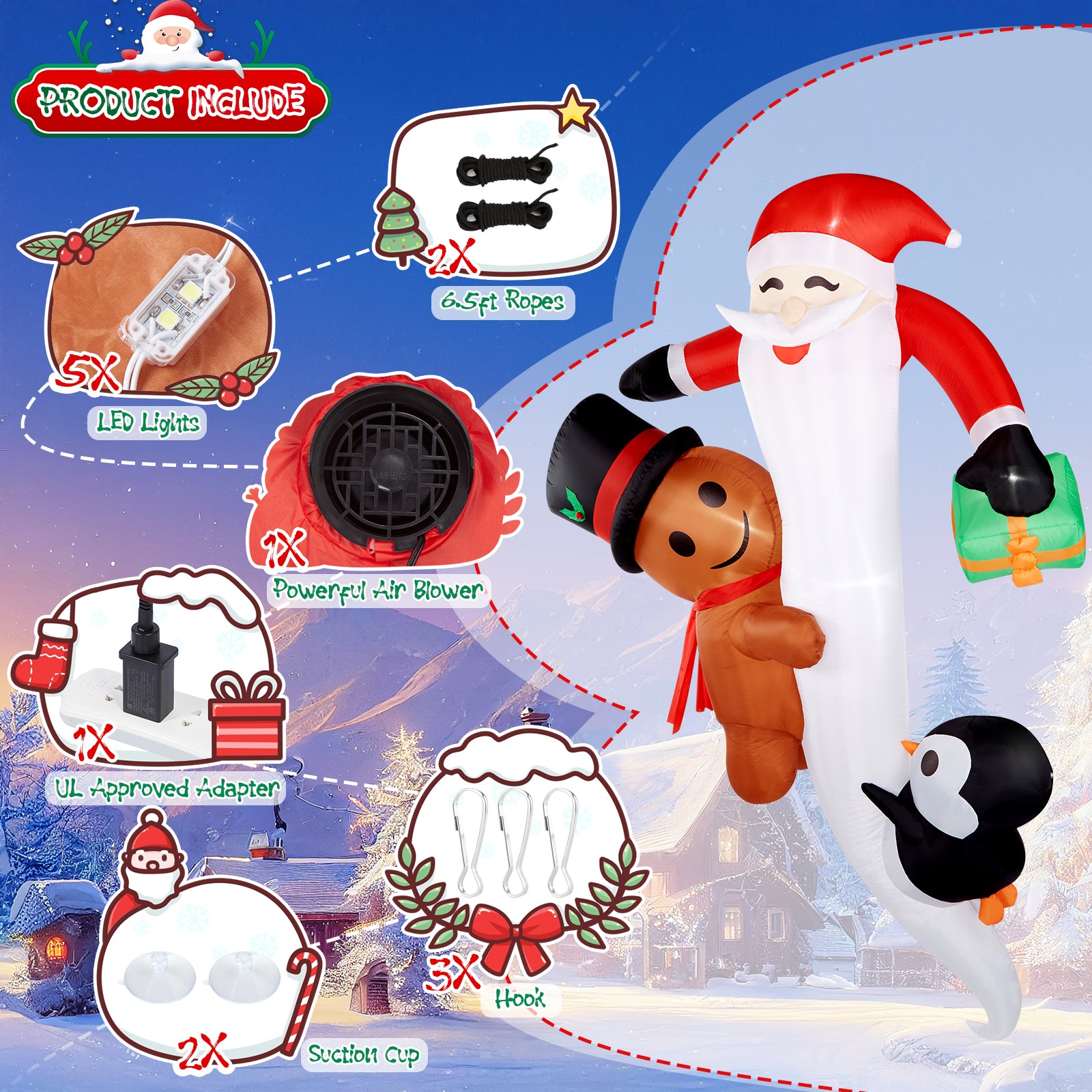 Funny & Creative 8FT LED Santa with Climbing Penguin: Bring a merry Christmas to everyone with our eye-catching 8FT Santa Claus inflatable! Designed with a playful twist, this cheerful Santa climbs your wall or window while a cute penguin adventures up his beard. The built-in bright LEDs illuminate the entire figure, creating a magical nighttime display perfect for outdoor Christmas decorations. Ideal for yards, gardens, patios, malls, and lawns, it’s sure to spread joy and strengthen the festive atmosphere.
