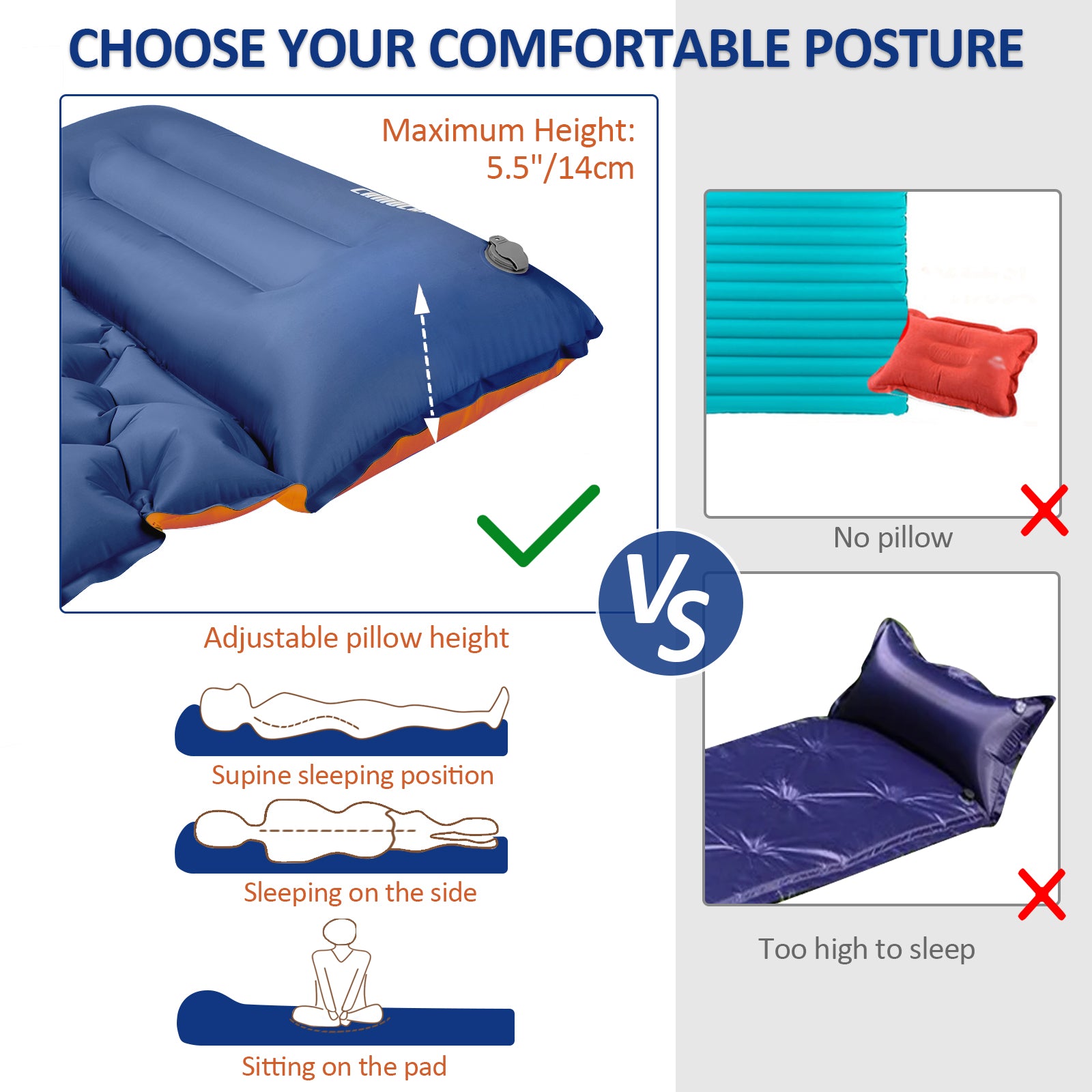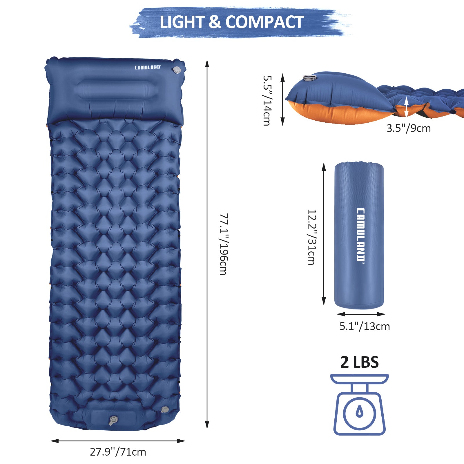 LIGHTWEIGHT, COMPACT & PORTABLE: The sleeping pad has been designed with portability in mind. Weighing only 2 pounds and packing down to a small size of 12 * 5 inches, this inflatable sleeping pad is easy to carry and won't take up much space in your backpack, making it perfect for camping, hiking, and traveling. It also comes with a built-in pillow, which saves enough trouble of taking the pillow outside.