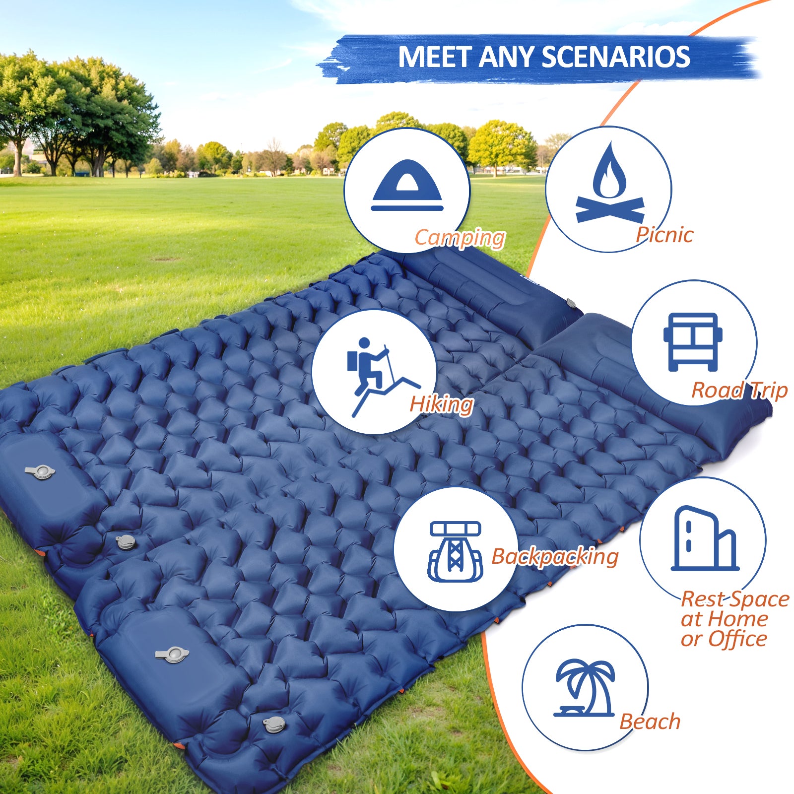 EASY SETUP: Inflating and deflating the sleeping pad is a breeze thanks to its user-friendly design. The inflatable sleeping pad is upgraded with a built-in foot pump and a leak-free film deflation valve, you can quickly set up your sleeping space and deflate it just as easily when it's time to pack up and move on. The built-in pillow has an independent air chamber for inflation.