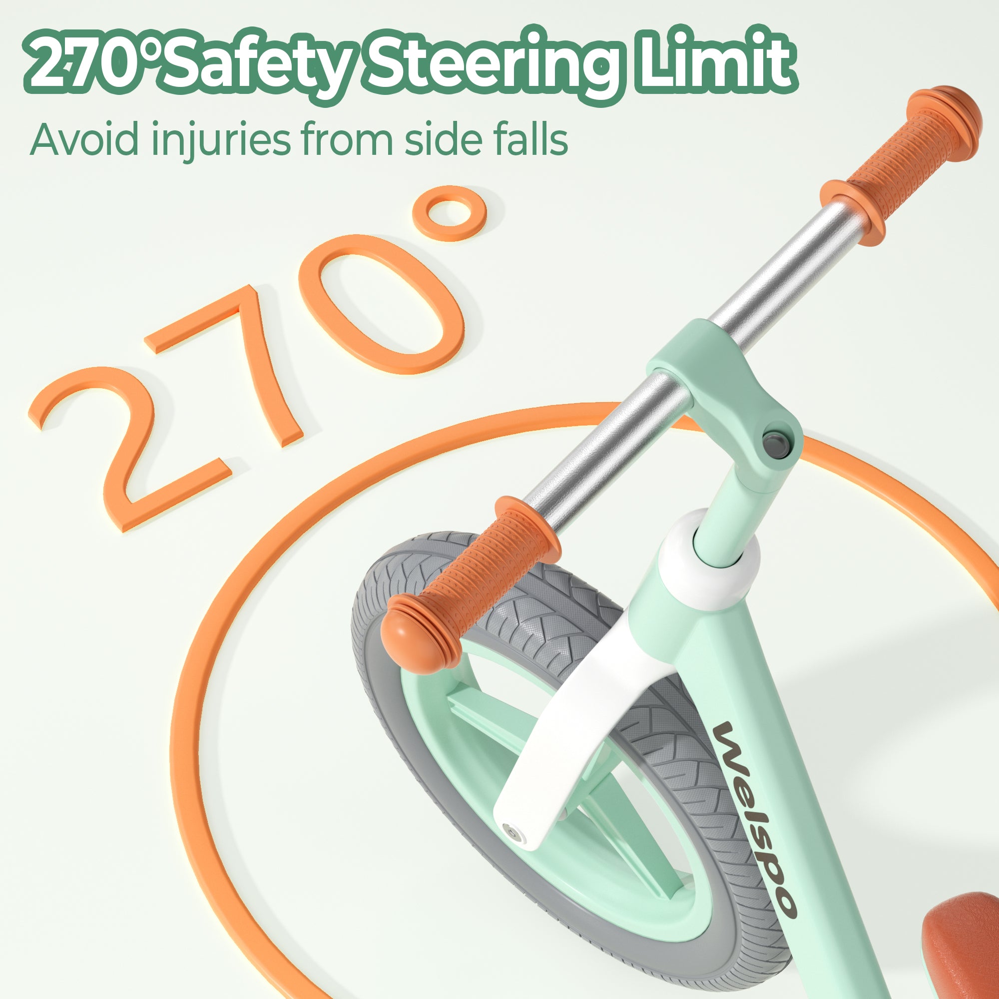 The 270° safety steering limit handlebar restricts the turning radius, enhancing the safety of the balance bike riding experience.