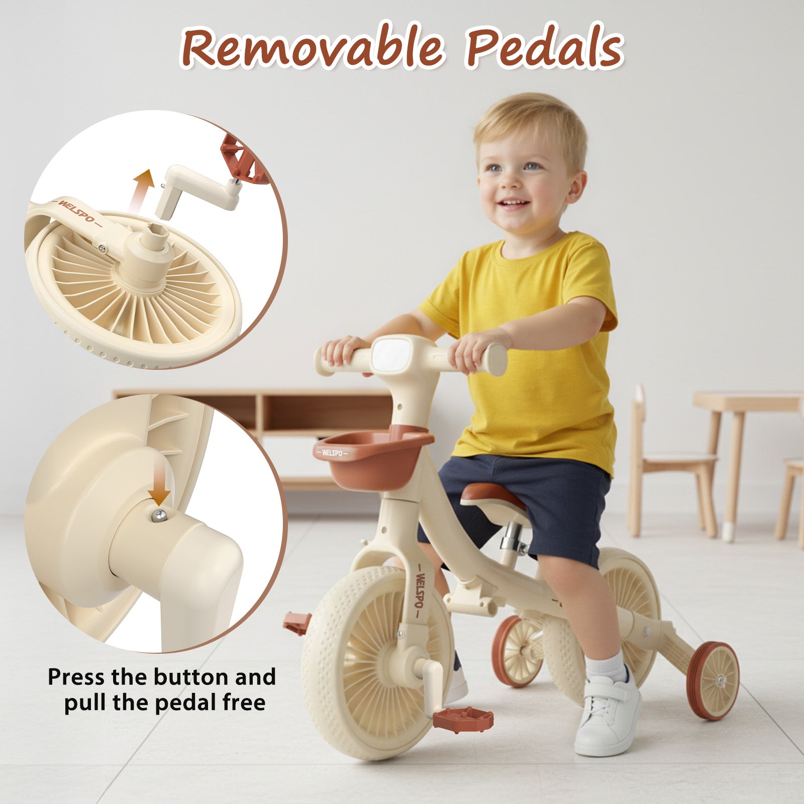 【5-in-1 Toddler Tricycle 】This toddler tricycle easily switches between push trike, toddler tricycle, walking trike, baby balance bike, and pedal bike. Designed to grow with kids ages 2-5, it provides multiple riding options for different stages of development.