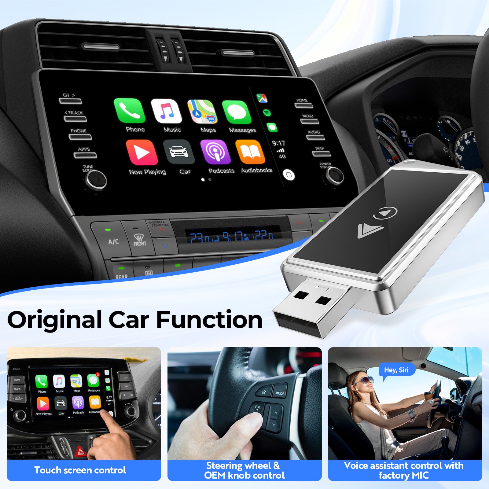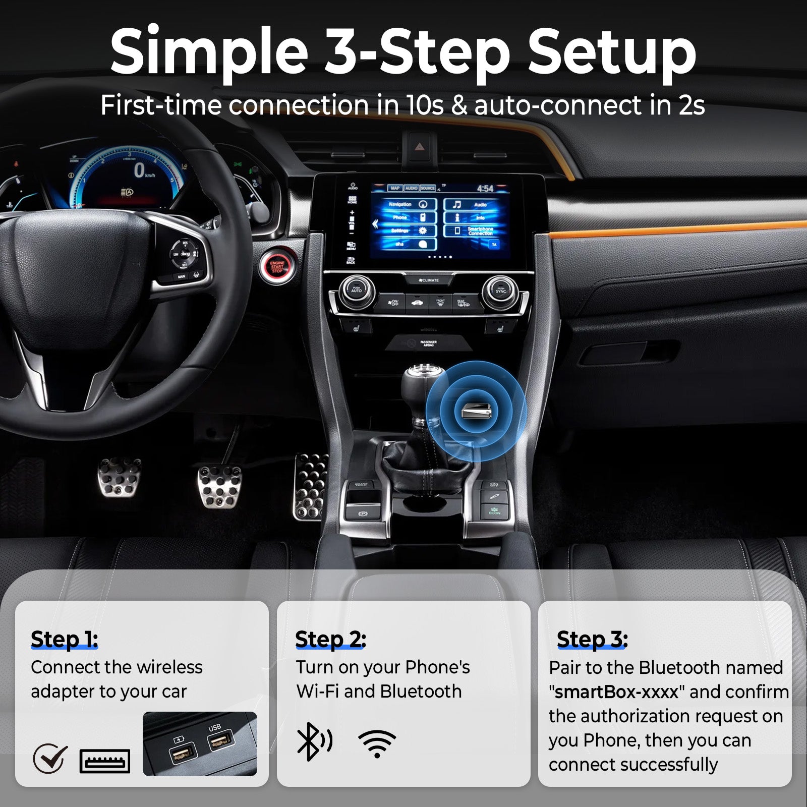 【Stable & Fast Transmission】Equipped with upgraded dual-core chips and 2.4G/5G WiFi, this wireless carplay adapter ensures smooth operation with minimal delay, maintaining clear sound and seamless screen response.