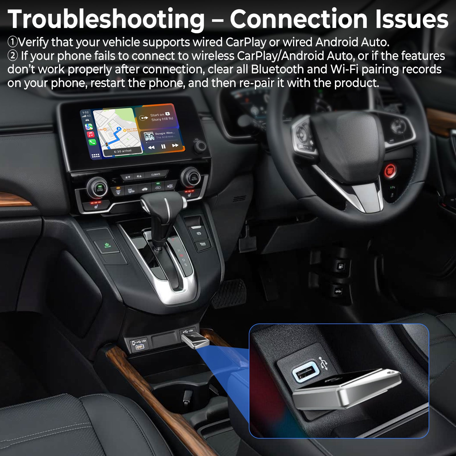 【Troubleshooting-Connection Issues】 ①Verify that your vehicle supports wired CarPlay or wired Android Auto. ②If your phone fails to connect to wireless CarPlay/Android Auto, or if the features don’t work properly after connection, clear all Bluetooth and Wi-Fi pairing records on your phone, restart the phone, and then re-pair it with the product.
