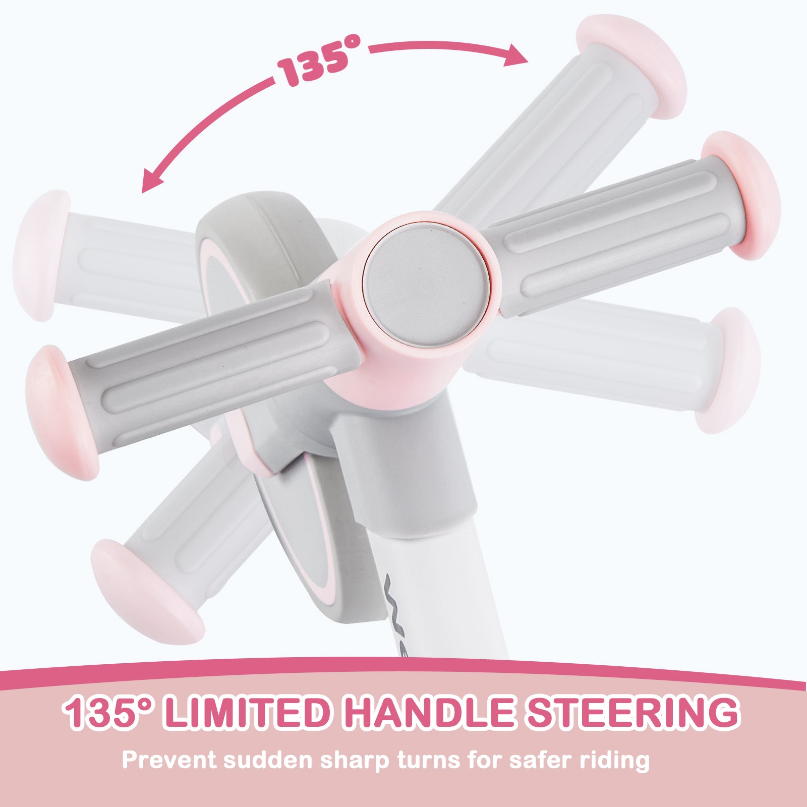 Sturdy and Safe Design - Weigh only 3 lbs. Height from ground to handle(1.1ft) ,ground to seat(0.8ft) ensures your child’s feet are always touching the ground so they stay in control of their speed, stopping, and movement. With 135°steering limit to prevent your baby from rolling over.